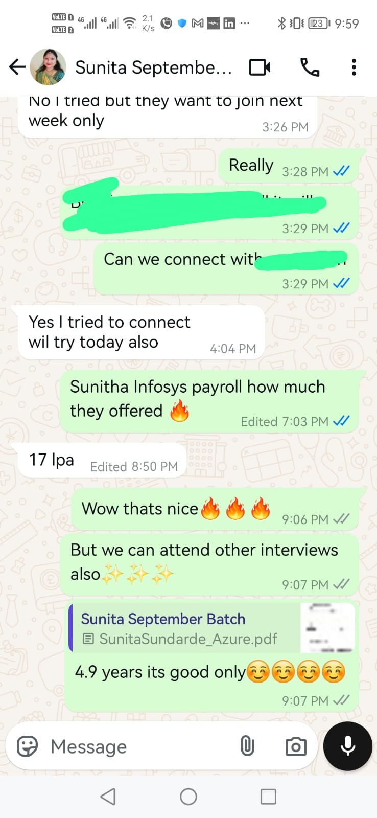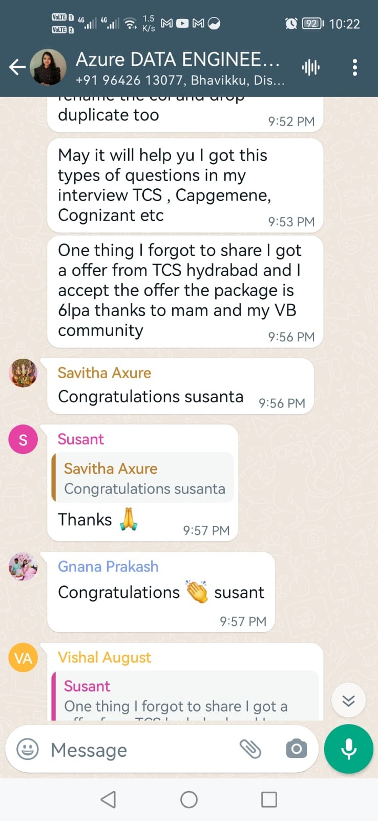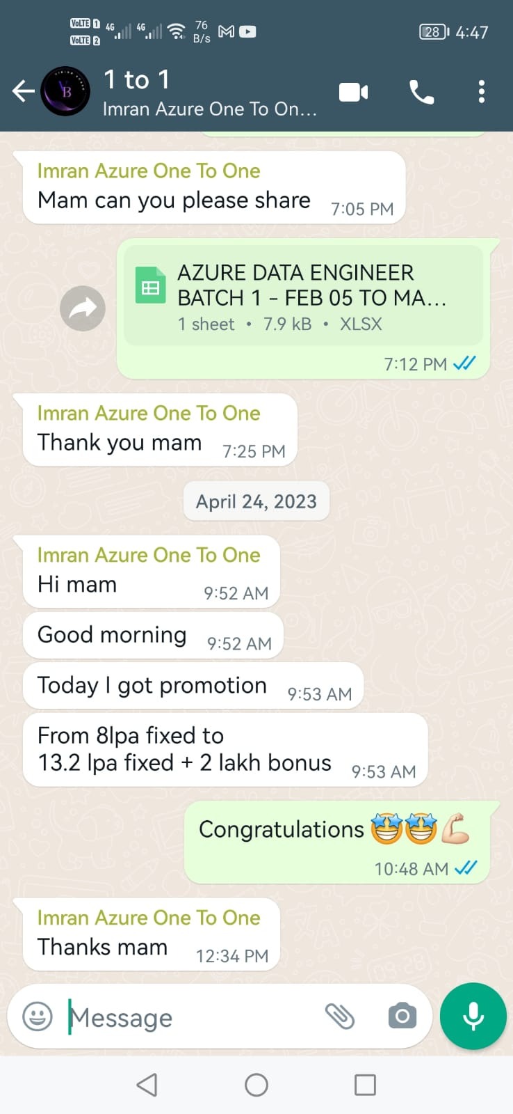 As a seasoned data professional, I was seeking a course to deepen my understanding of Azure data solutions. The Azure Data Engineering course exceeded my expectations. The comprehensive curriculum, coupled with hands-on labs, empowered me to master Azure services like Azure Synapse Analytics and Azure Data Factory. The instructors' expertise and real-world insights made complex concepts digestible. Thanks to this course, I've seamlessly integrated Azure solutions into our data workflows, resulting in significant cost savings and enhanced data processing efficiency