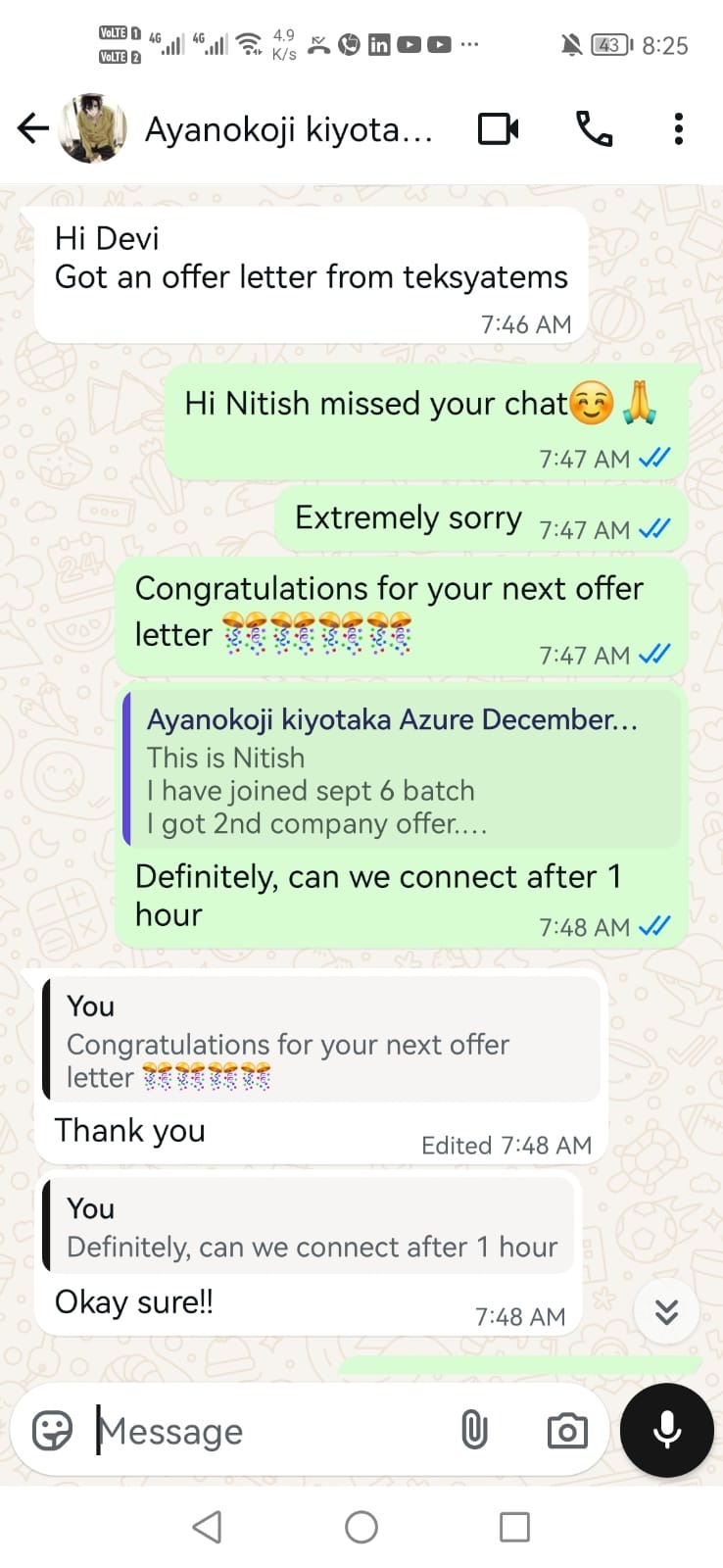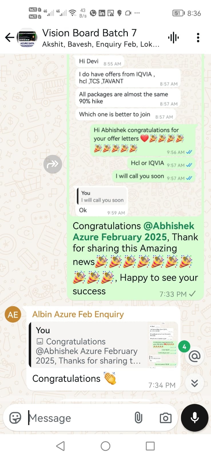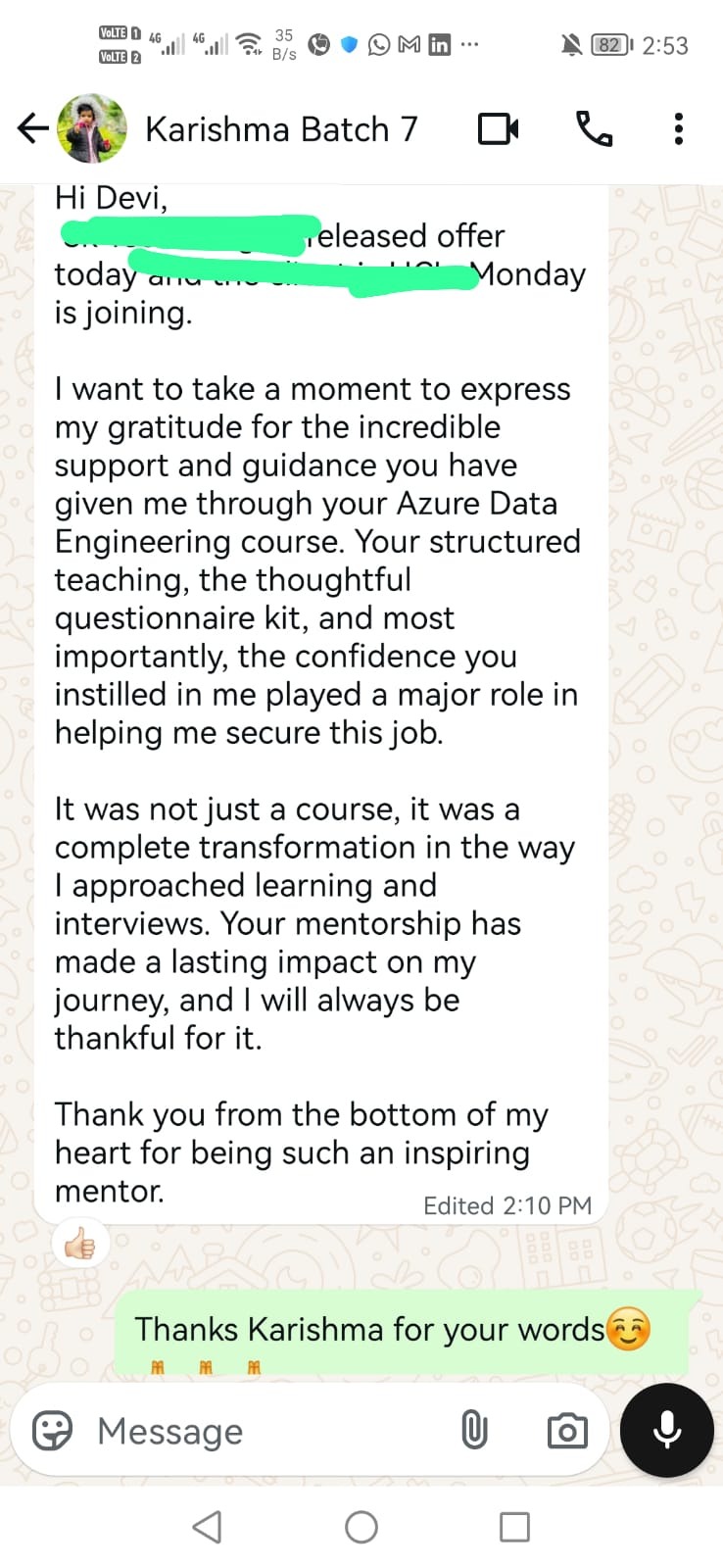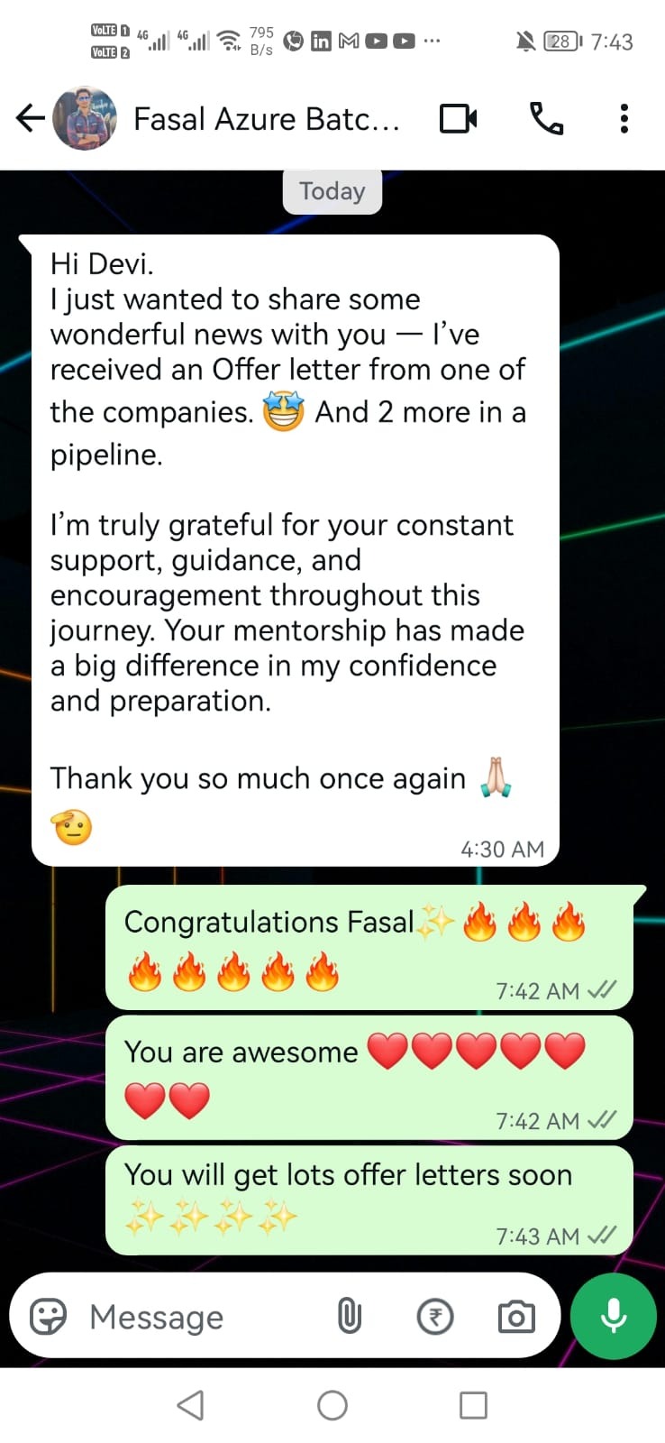 Transitioning into the field of data engineering seemed daunting until I enrolled in the Azure Data Engineering course. Coming from a non-technical background, I was impressed by how the course demystified Azure's data services and provided step-by-step guidance on building scalable data pipelines. The interactive learning environment and supportive instructors helped me gain confidence in working with Azure technologies. Upon completing the course, I landed a data engineering role at a leading tech company, and I credit this achievement to the practical skills and knowledge I acquired through the program.